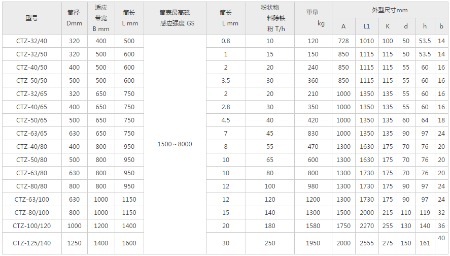 CTZ型中场强半磁滚筒(CTZ型中场强全磁滚筒结构与RCT型参数等同),多用于对粉状、颗粒状、小块状物料的净化处理,或对铁质的回收利用,对防止研磨机、压榨机的破坏和磨损起着可靠的保护作用。它安装方便、吸力强、低能耗、连续工作、操作简单。